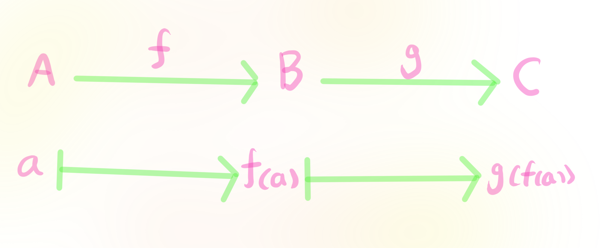 함수 $f:A→B$로부터 $A$의 각 원소 $a$는 함수값 $F(a)∈B$ 로 대응된다. 그러면 함수 $g:B→C$로부터 $B$의 원소 $f(a)$는 $g$의 함수값 $g(f(a))∈C$로 대응된다. 이 방식으로
