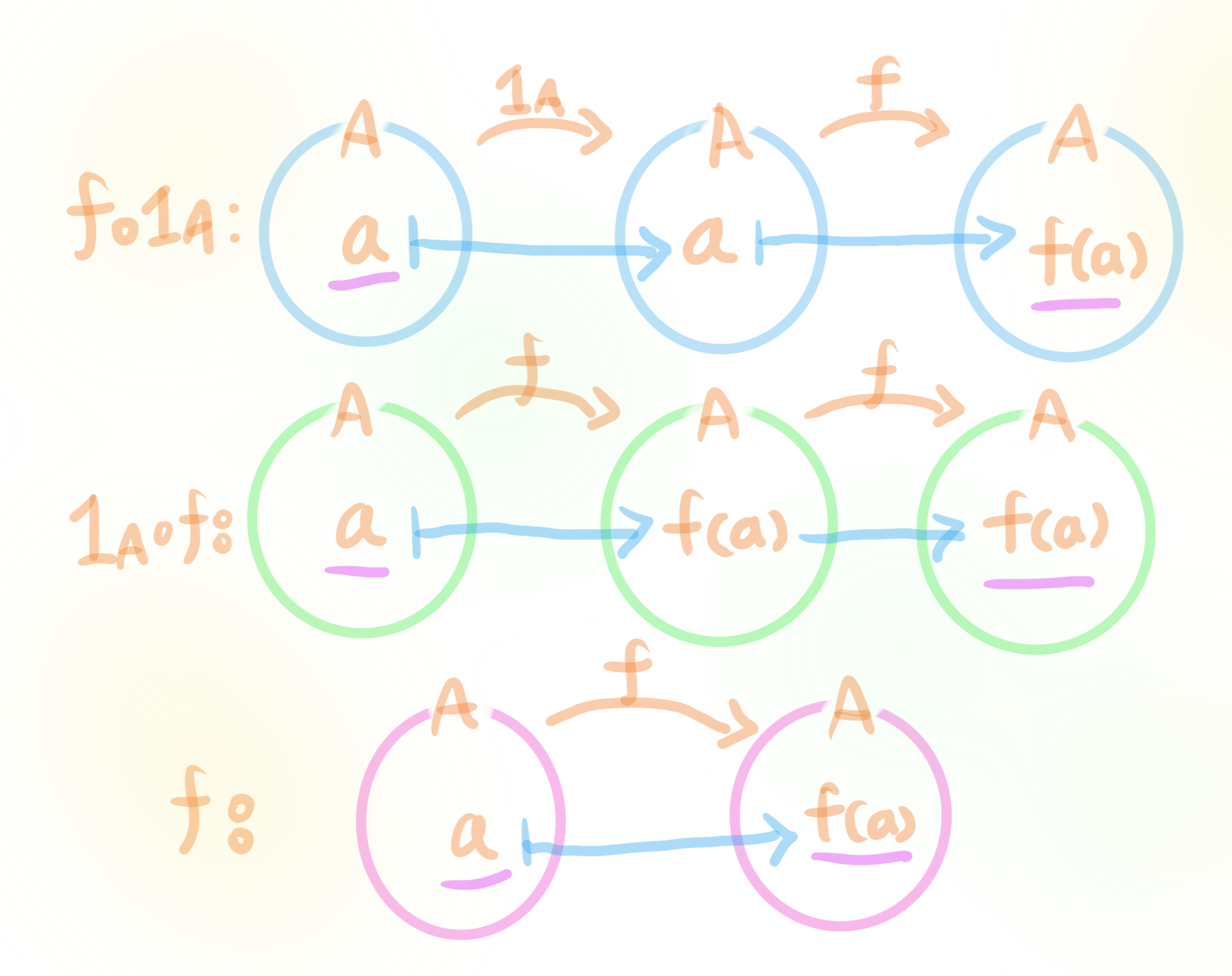 $f\circ{1_A}=1A\circ{f}=f$이다. (군의 $a*e=e*a=a$에 해당한다.)