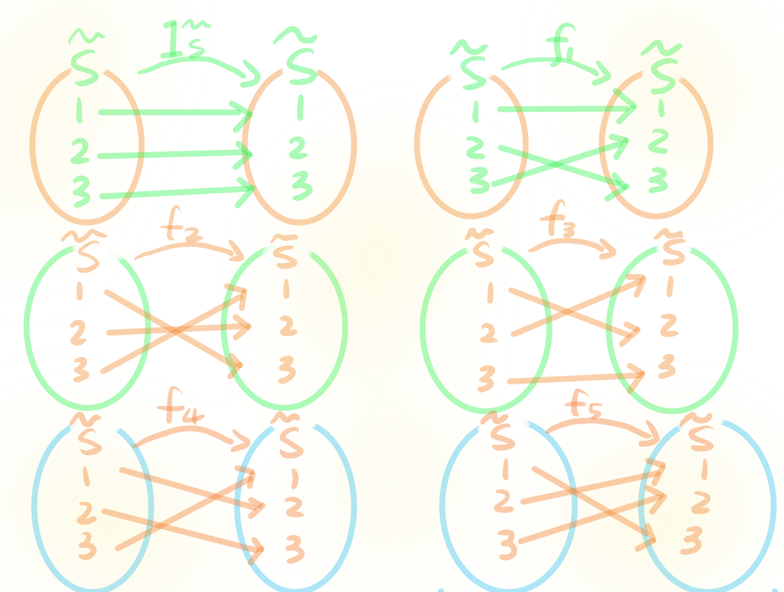 비슷하게, $S$= ${1,2,3}$에 대해 6가지 함수를 정의하자: