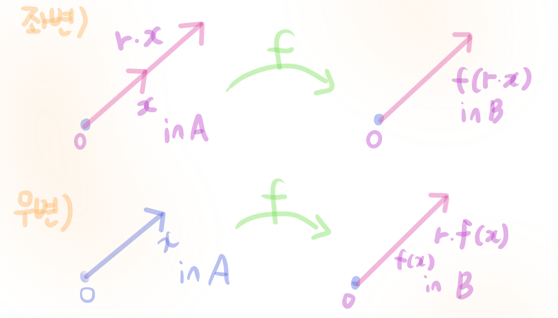 코멘트 다음과 갗이 선형함수를 정의해도 같은 의미가 된다: 두 벡터공간 A,B에 대하여 $f:A\Longrightarrow$B가 다음의 조건을 만족하면 선형함수라고 부른다: