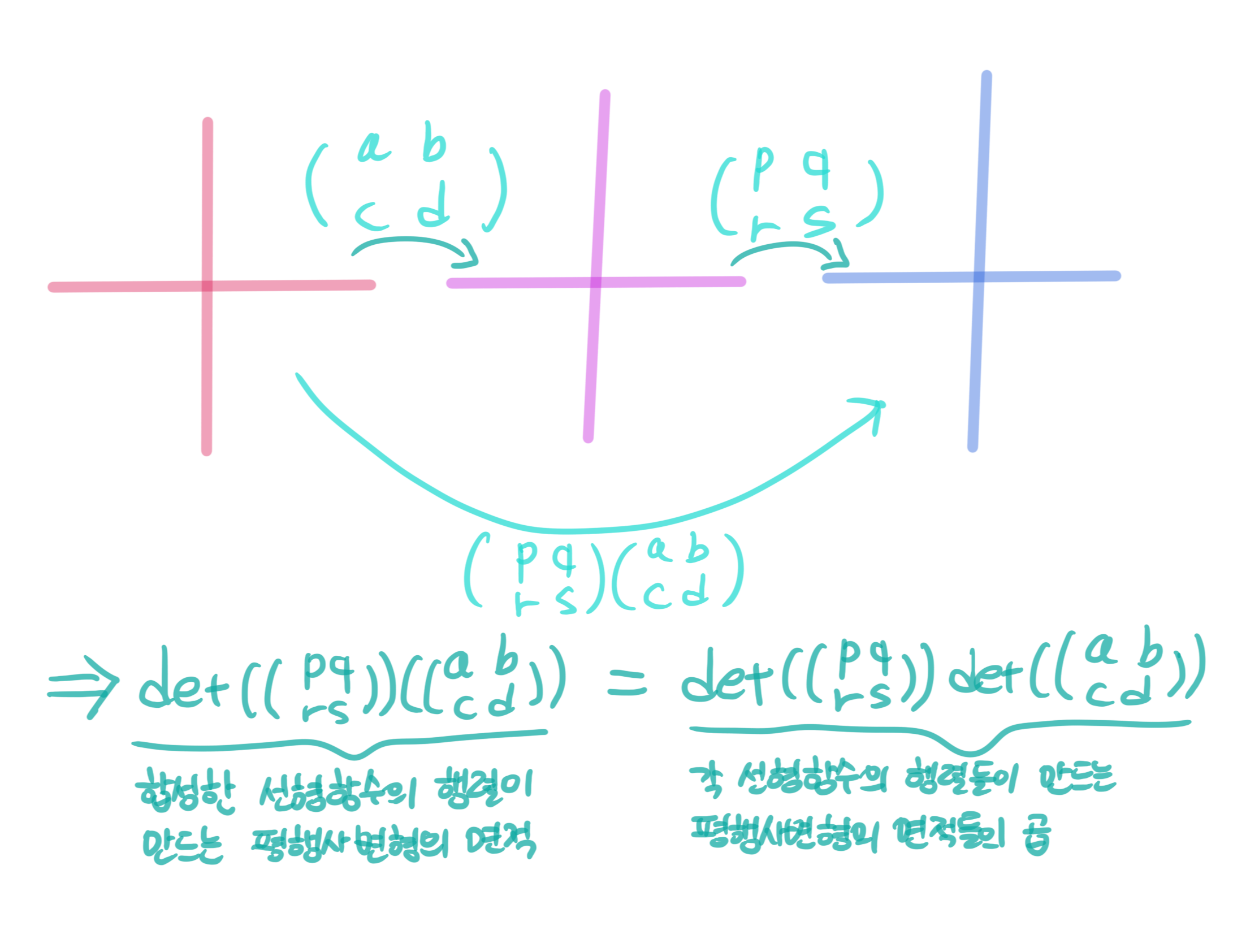 주장 행렬식 $ad-bc$는 두 벡터 $(a,b)$와 $(c,d)$가 만들어내는 평행사변형의 면적에 해당한다. 즉,