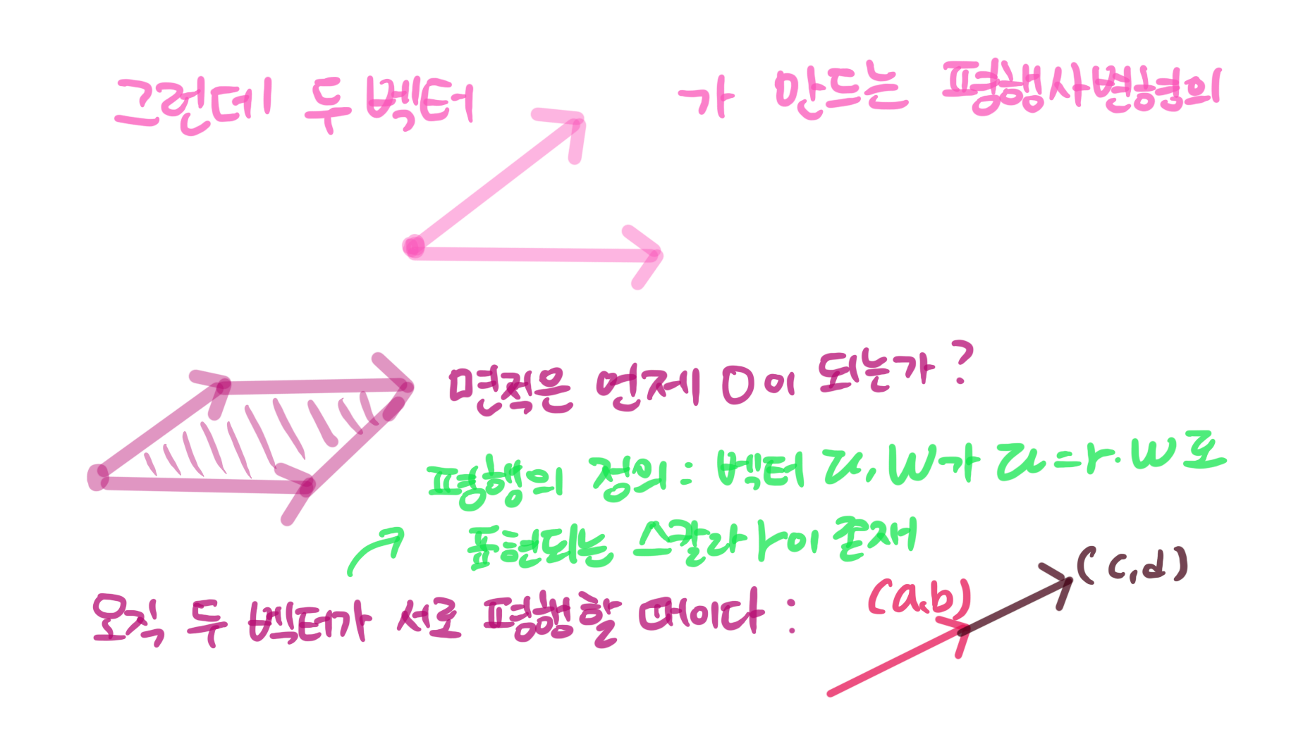 이는 어떤 함의를 갖는가? 관찰 (3)으로부터 $ad-bc$는 두 벡터 $(a,b)$와 $(c,d)$가 만들어내는 평행사변형의 면적임을 알았다. 즉 함수 $f$가 전단사함수 라는 것은 두 벡터 $(a,b)$,$(c,d)$가 만드는 평행사변형의 면적이 0 이 아님과 같다는 것이다.