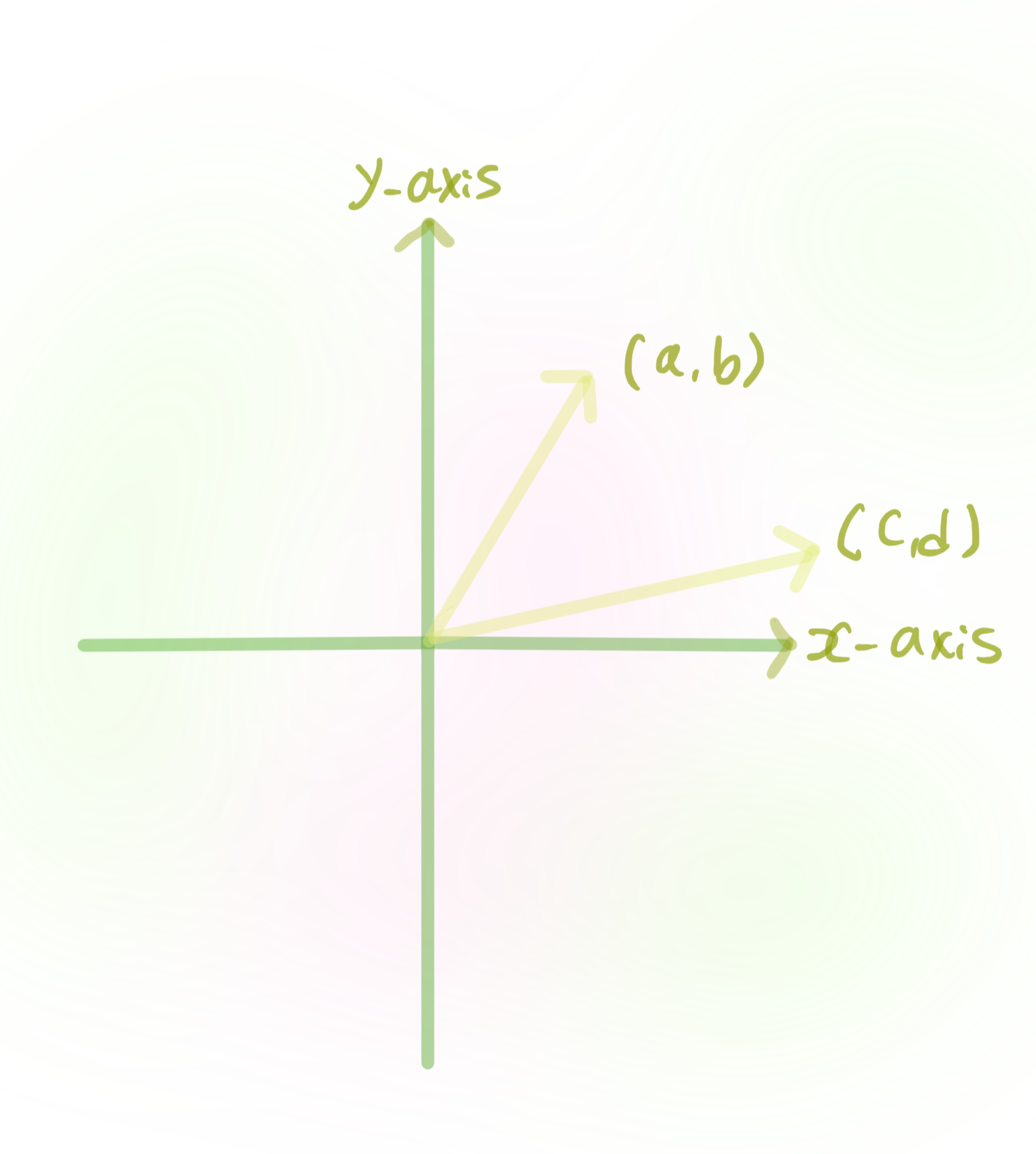 그런데 $\left(\begin{array}{ll}a& \text {b} \\ \text {c } & \text {d}\end{array}\right)\left(\begin{array}{cc}x \\ y \end{array}\right)=\left(\begin{array}{cc}ax+by\\ cx+dy\end{array}\right)$에서 $a,b$와 $c,d$가 계산에 사용되는 위치가 다름을 알수있다. 그러므로 따로 두 순서쌍 $(a,b)$와 $(c,d)$를 고려하자. 이들은 $\mathbb{R}^{2}$의 원소이므로 다음과 같이 좌표평면 위에 그릴 수 있다: