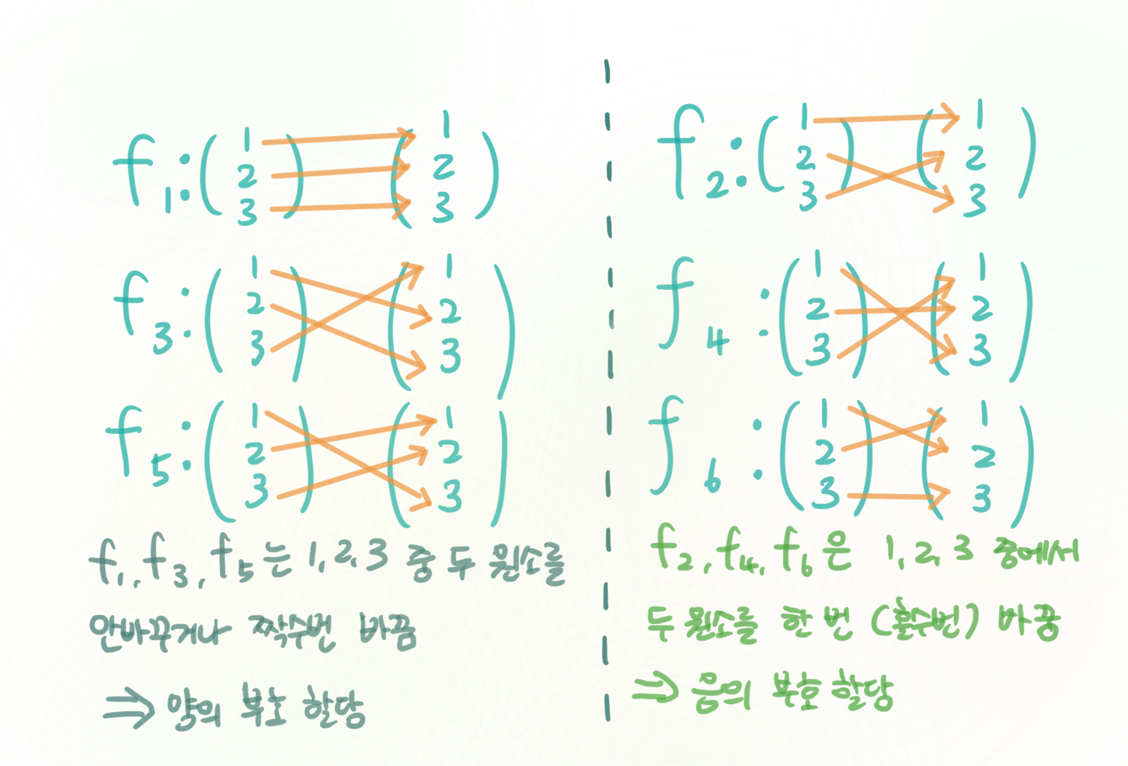에서 $f_1$은 1,2의 순서를 바꾸지 않아서 양의 부호를, $f_2$는 1과 2를 한번만 바꾸어서 음의 부호를 할당한 것으로 간주할 수 있습니다.