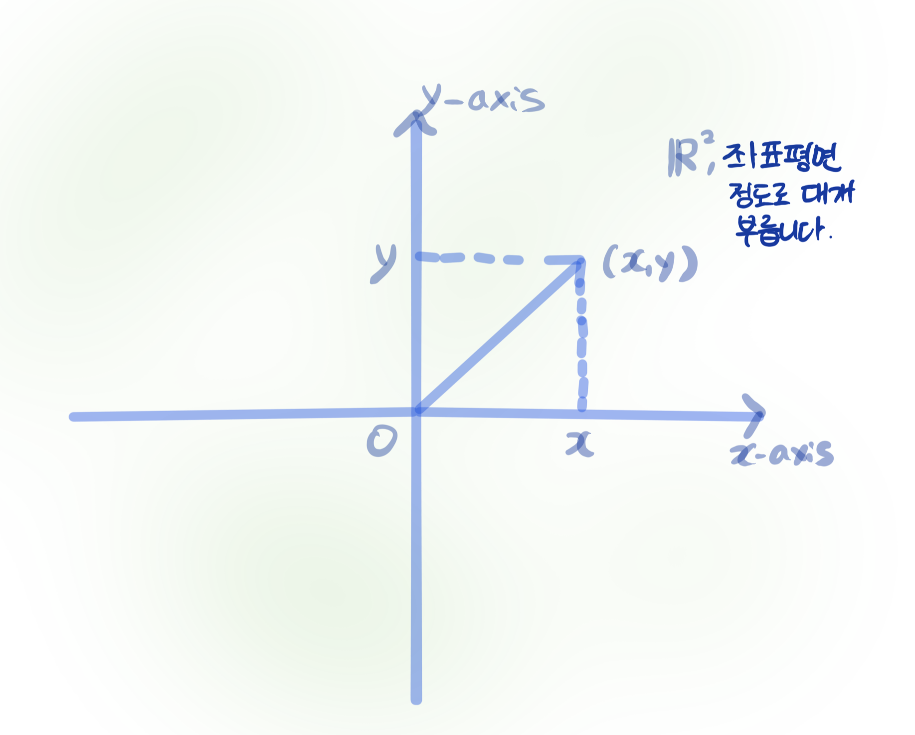 $\mathbb{R}^{2}={(x,y)|x,y\in\mathbb{R}}$은 2차원 평면으로서 다음과 같이 그릴 수 있다: